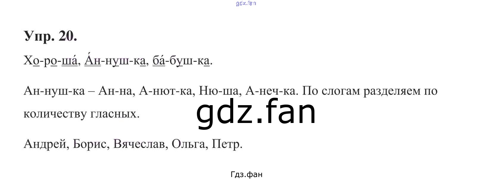 Проверка домашнего задания всегда занимает большое количество времени. На помощь приходит ГДЗ фан по Русскому языку первого класса. Здесь собраны популярные ответы на 20 (стр. 20) Русский язык 1 класс Бунеев Р.Н.