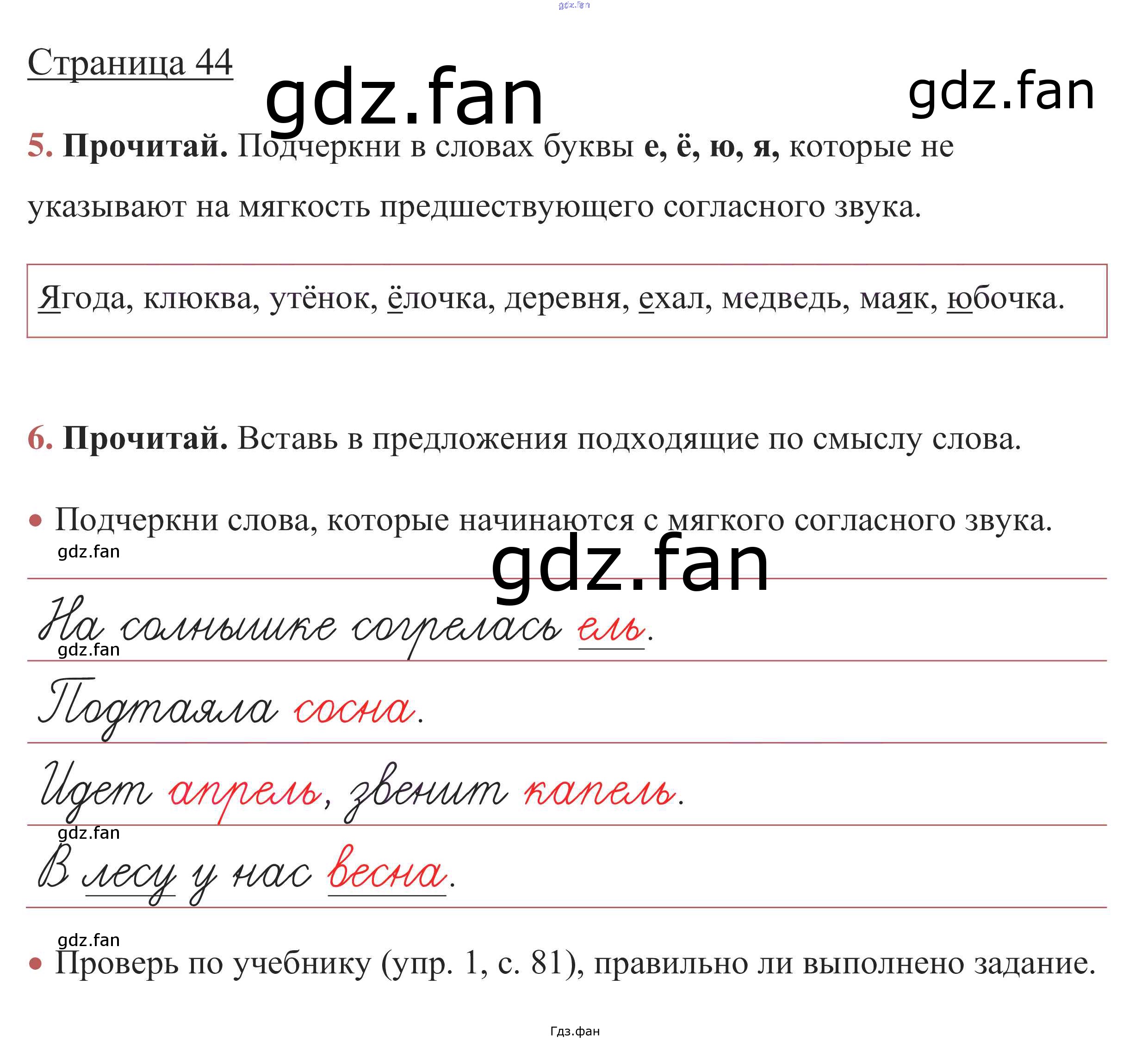Проверка домашнего задания всегда занимает большое количество времени. На помощь приходит ГДЗ фан по Русскому языку первого класса. Здесь собраны популярные ответы на стр. 44 (упражнение 5, 6) Русский язык 1 класс рабочая тетрадь Канакина В.П.