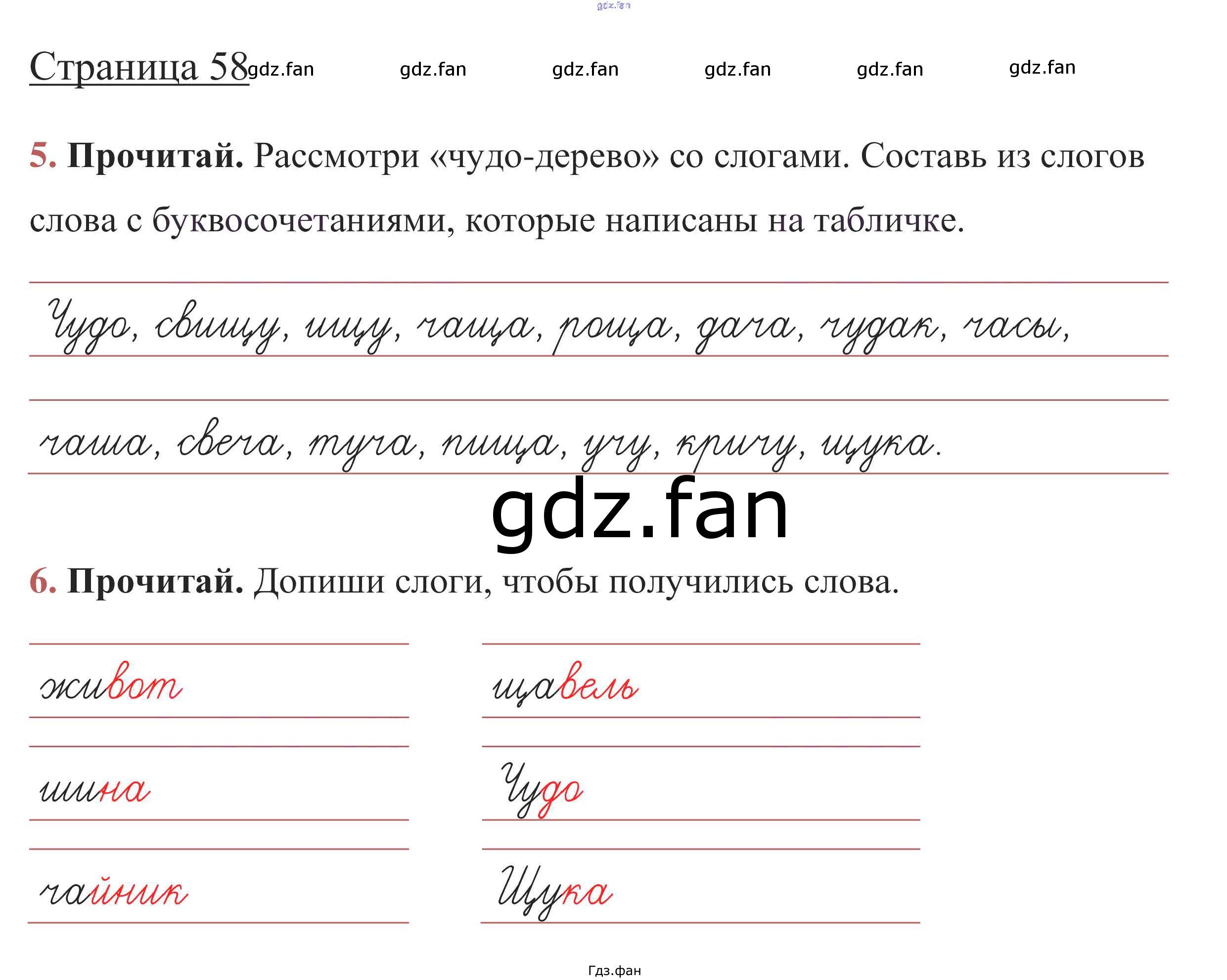 Проверка домашнего задания всегда занимает большое количество времени. На помощь приходит ГДЗ фан по Русскому языку первого класса. Здесь собраны популярные ответы на стр. 58 (упражнение 5, 6) Русский язык 1 класс рабочая тетрадь Канакина В.П.