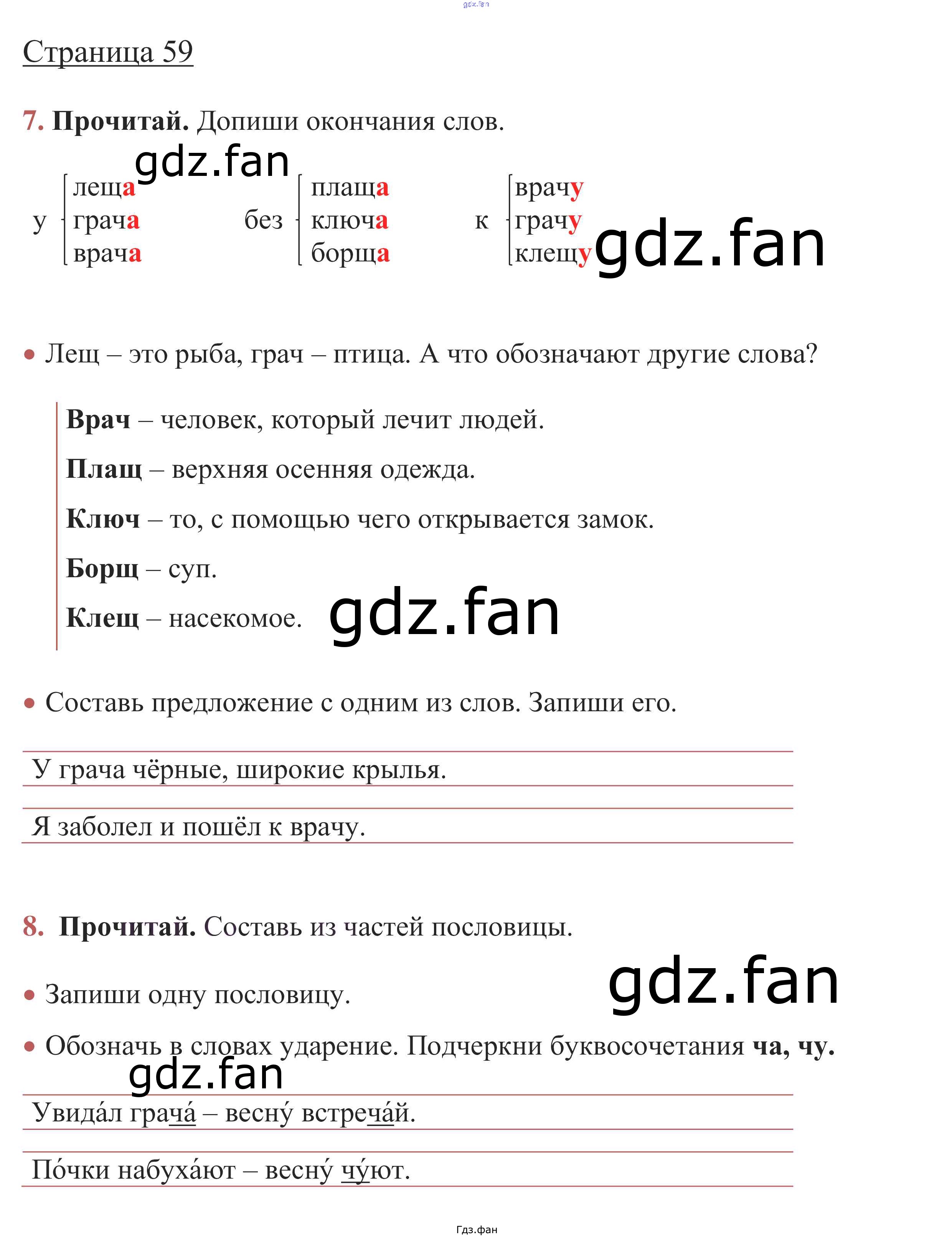Проверка домашнего задания всегда занимает большое количество времени. На помощь приходит ГДЗ фан по Русскому языку первого класса. Здесь собраны популярные ответы на стр. 59 (упражнение 7, 8) Русский язык 1 класс рабочая тетрадь Канакина В.П.