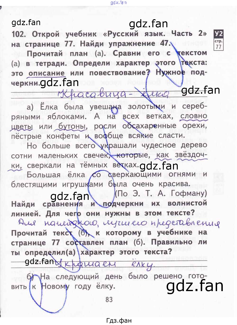 Проверка домашнего задания всегда занимает большое количество времени. На помощь приходит ГДЗ фан по Русскому языку второго класса. Здесь собраны популярные ответы на 83 (упражнения 102) Русский язык 2 класс тетрадь для самостоятельной работы Байкова Т.А.