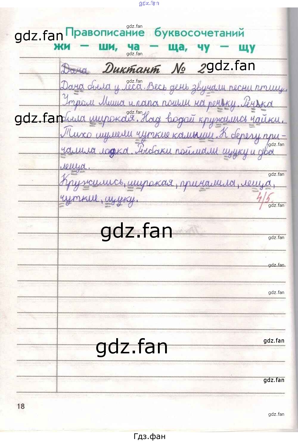 Проверка домашнего задания всегда занимает большое количество времени. На помощь приходит ГДЗ фан по Русскому языку второго класса. Здесь собраны популярные ответы на 18 (Правописание буквосочетаний жи - ши, ча - ща, чу - щу. Диктант №2) Русский язык 2 класс Проверочные и контрольные работы Бунеева Е.В.