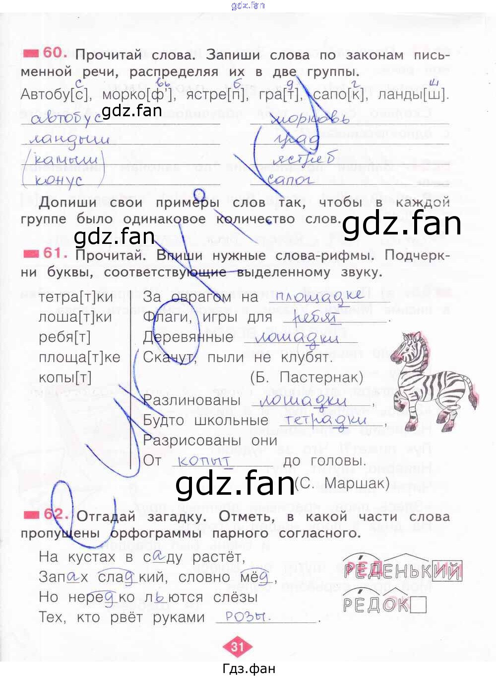 Проверка домашнего задания всегда занимает большое количество времени. На помощь приходит ГДЗ фан по Русскому языку второго класса. Здесь собраны популярные ответы на 31 (№ 60, 61, 62) Русский язык 2 класс рабочая тетрадь Яковлева С.Г.