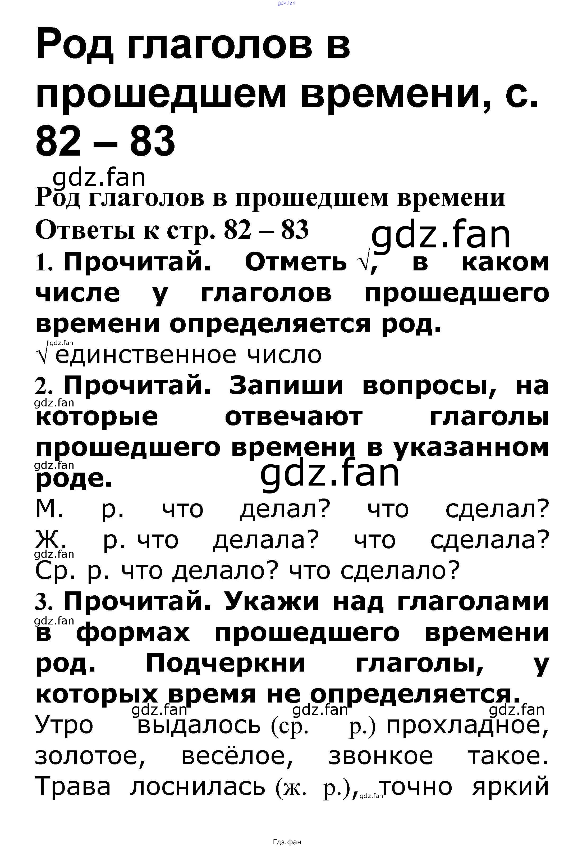 Проверка домашнего задания всегда занимает большое количество времени. На помощь приходит ГДЗ фан по Русскому языку третьего класса. Здесь собраны популярные ответы на 82-83 (Род глаголов в прошедшем времени № 1, 2, 3, 4, 5, 6, 7, 8, 9) Русский язык 3 класс проверочные работы Канакина В.П.