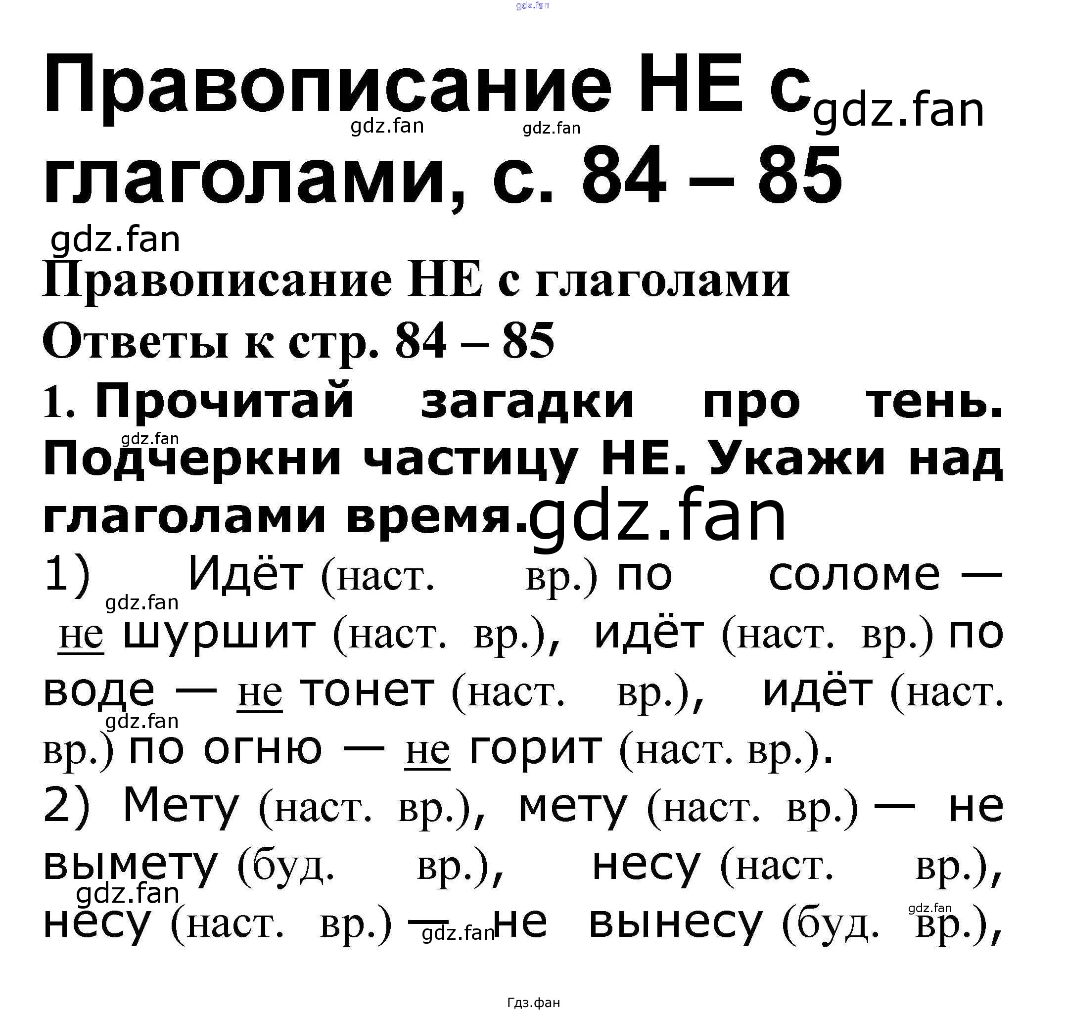 Проверка домашнего задания всегда занимает большое количество времени. На помощь приходит ГДЗ фан по Русскому языку третьего класса. Здесь собраны популярные ответы на 84-85 (Правописание НЕ с глаголами № 1, 2, 3, 4, 5, 6, 7) Русский язык 3 класс проверочные работы Канакина В.П.