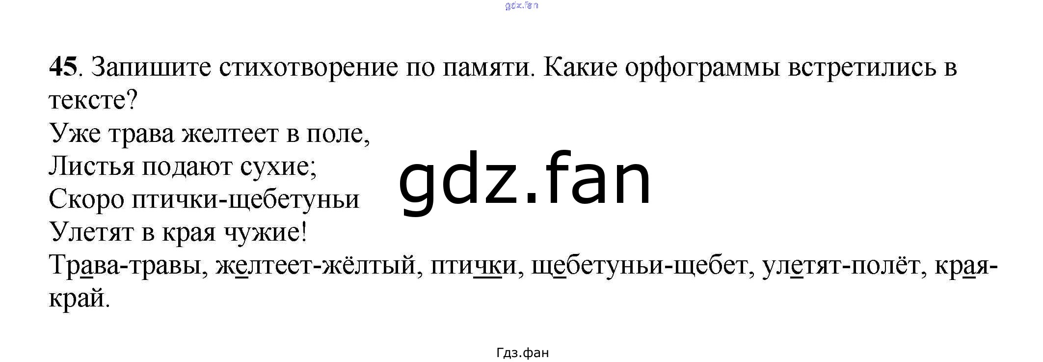 Проверка домашнего задания всегда занимает большое количество времени. На помощь приходит ГДЗ фан по Русскому языку третьего класса. Здесь собраны популярные ответы на 45 (стр. 34) Русский язык 3 класс Климанова Л.Ф.