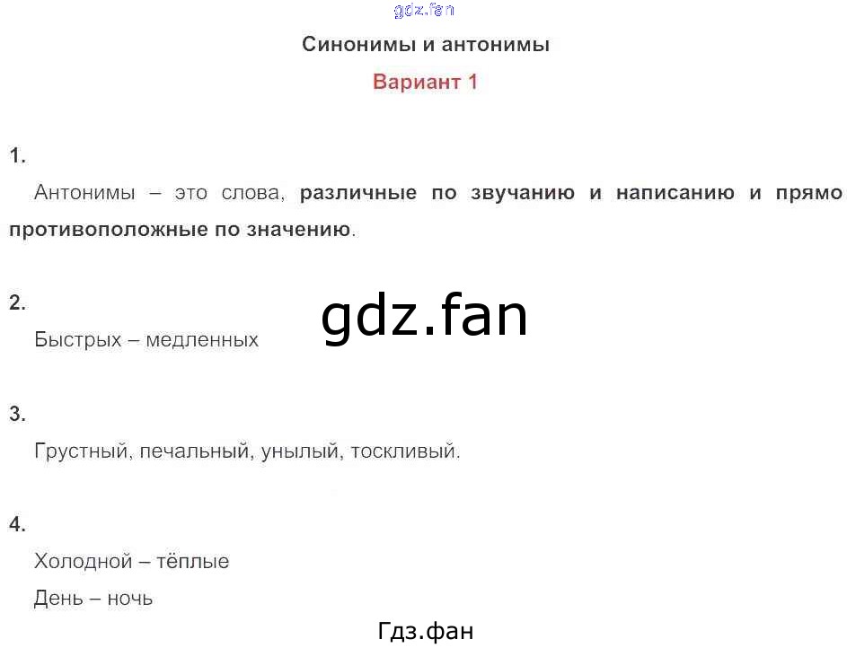 Проверка домашнего задания всегда занимает большое количество времени. На помощь приходит ГДЗ фан по Русскому языку третьего класса. Здесь собраны популярные ответы на 46 (Синонимы и антонимы. Вариант 1 № 1, 2, 3, 4) Русский язык 3 класс контрольные работы Крылова О.Н.