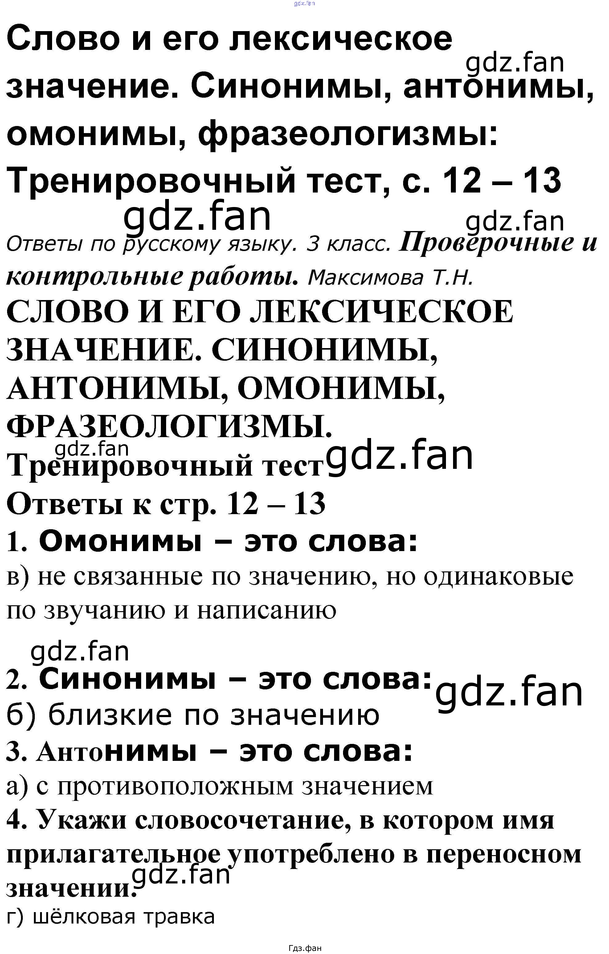 Проверка домашнего задания всегда занимает большое количество времени. На помощь приходит ГДЗ фан по Русскому языку третьего класса. Здесь собраны популярные ответы на 12-13 (Тренировочный тест № 1, 2, 3, 4, 5) Русский язык 3 класс проверочные и контрольные работы Максимова Т.Н.