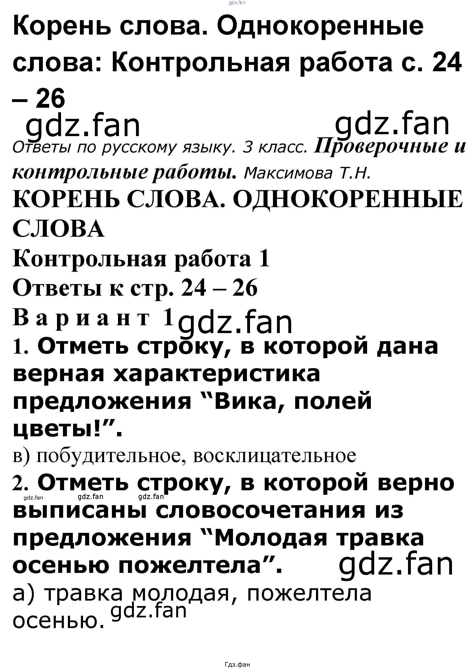 Проверка домашнего задания всегда занимает большое количество времени. На помощь приходит ГДЗ фан по Русскому языку третьего класса. Здесь собраны популярные ответы на 24-26 (Контрольная работа. Вариант 1 № 1, 2, 3, 4, 5, 6, 7, 8. Вариант 2 № 1, 2, 3, 4, 5, 6, 7, 8) Русский язык 3 класс проверочные и контрольные работы Максимова Т.Н.