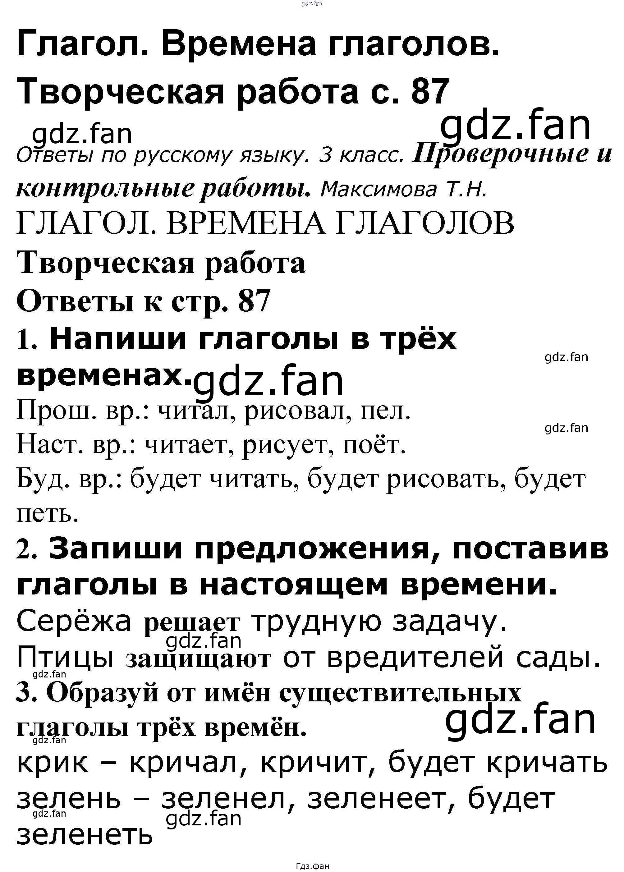 Проверка домашнего задания всегда занимает большое количество времени. На помощь приходит ГДЗ фан по Русскому языку третьего класса. Здесь собраны популярные ответы на 87 (Творческая работа № 1, 2, 3) Русский язык 3 класс проверочные и контрольные работы Максимова Т.Н.
