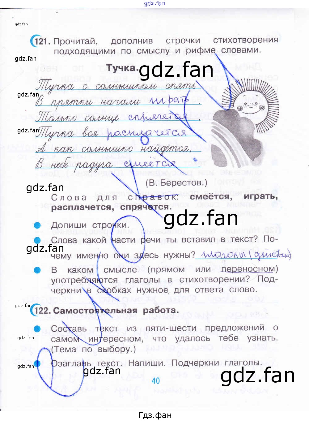 Проверка домашнего задания всегда занимает большое количество времени. На помощь приходит ГДЗ фан по Русскому языку третьего класса. Здесь собраны популярные ответы на 40 (№ 121, 122) Русский язык 3 класс рабочая тетрадь Рамзаева Т.Г.