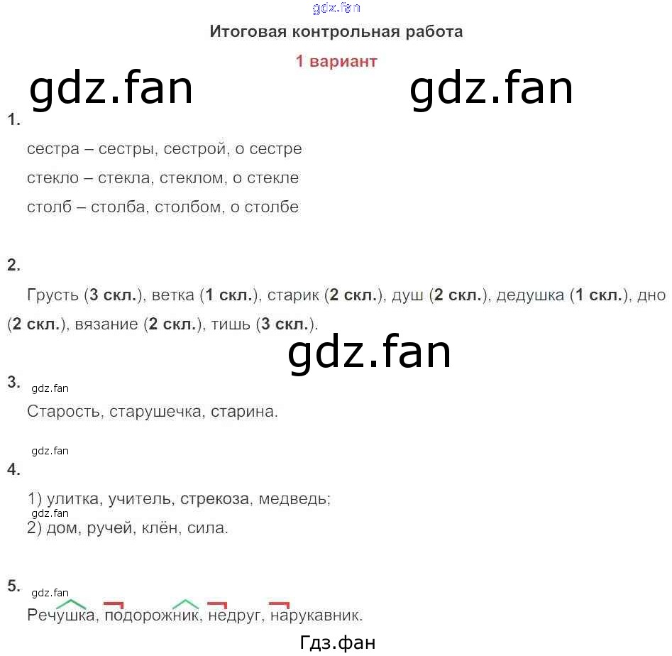 Проверка домашнего задания всегда занимает большое количество времени. На помощь приходит ГДЗ фан по Русскому языку третьего класса. Здесь собраны популярные ответы на 67 (Итоговая контрольная работа. Вариант 1 № 1, 2, 3, 4, 5) Русский язык 3 класс тетрадь для контрольных работ Романова В.Ю.