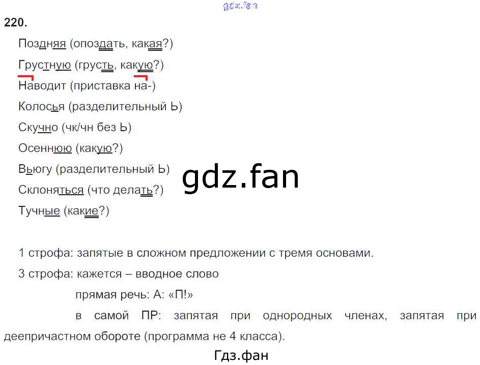 Проверка домашнего задания всегда занимает большое количество времени. На помощь приходит ГДЗ фан по Русскому языку четвертого класса. Здесь собраны популярные ответы на 220 (стр. 48) Русский язык 4 класс Бунеев Р.Н.