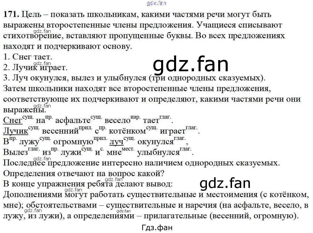 Проверка домашнего задания всегда занимает большое количество времени. На помощь приходит ГДЗ фан по Русскому языку четвертого класса. Здесь собраны популярные ответы на 171 (стр. 167) Русский язык 4 класс Каленчук М.Л.
