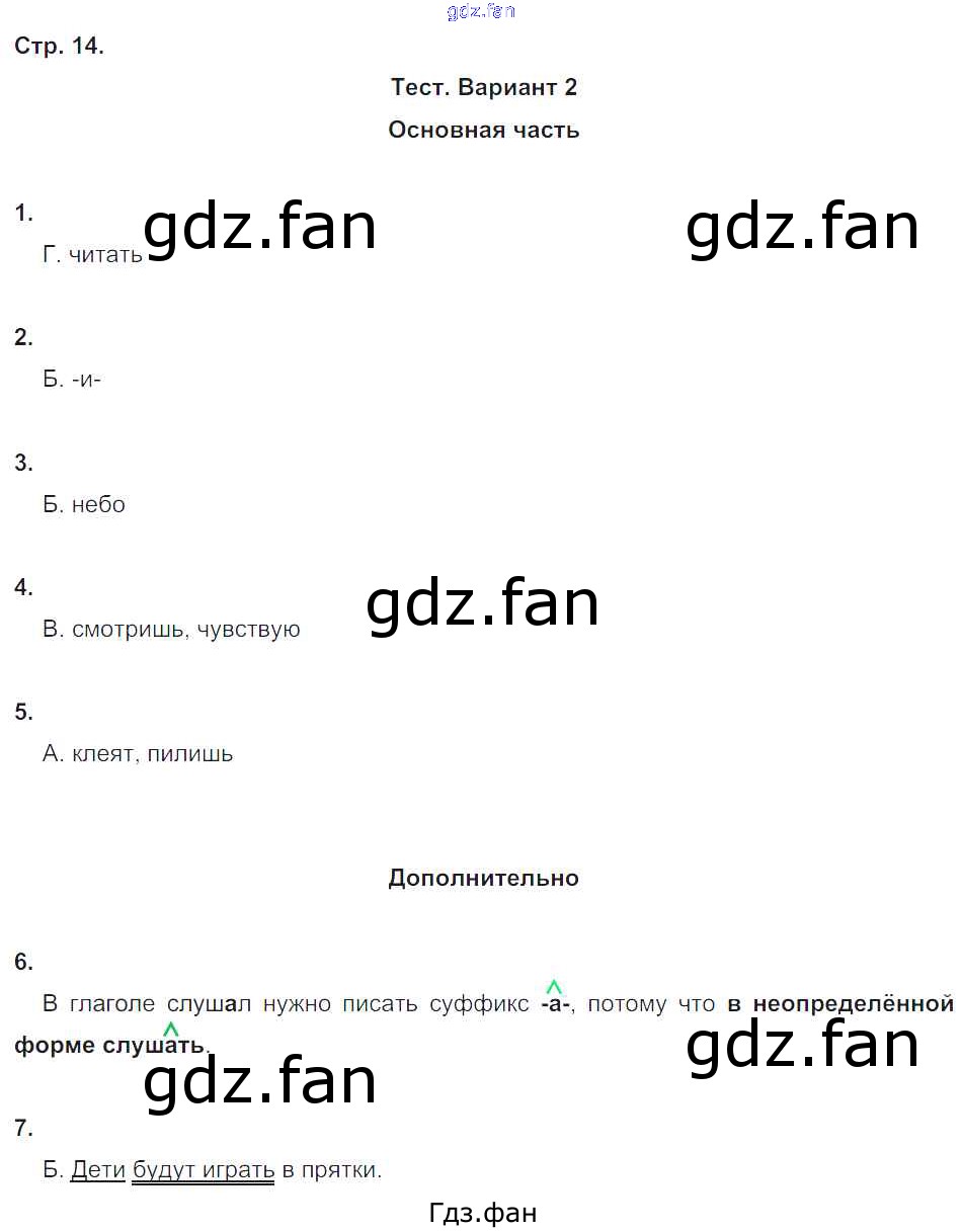 Проверка домашнего задания всегда занимает большое количество времени. На помощь приходит ГДЗ фан по Русскому языку четвертого класса. Здесь собраны популярные ответы на 14 (Вариант 2. № 1, 2, 3, 4, 5, 6, 7) Русский язык 4 класс тесты и самостоятельные работы для текущего контроля Калинина О.Б. (к уч. Желтовской)