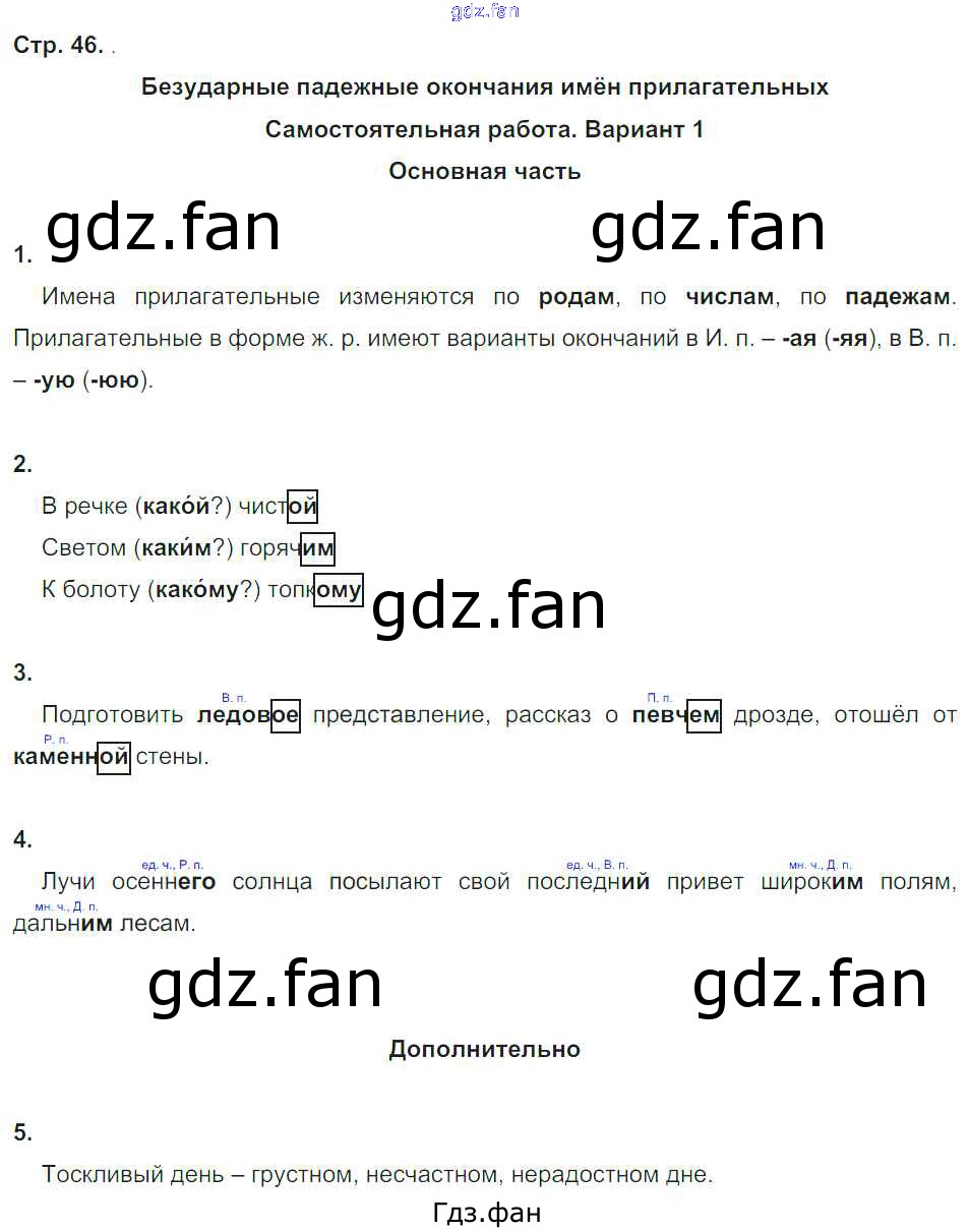 Проверка домашнего задания всегда занимает большое количество времени. На помощь приходит ГДЗ фан по Русскому языку четвертого класса. Здесь собраны популярные ответы на 46 (Безударные падежные окончания имён прилагательных. Самостоятельная работа. Вариант 1. № 1, 2, 3, 4, 5) Русский язык 4 класс тесты и самостоятельные работы для текущего контроля Калинина О.Б. (к уч. Желтовской)