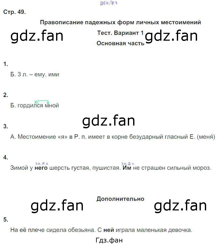 Проверка домашнего задания всегда занимает большое количество времени. На помощь приходит ГДЗ фан по Русскому языку четвертого класса. Здесь собраны популярные ответы на 49 (Правописание падежных форм личных местоимений. Тест 1. Вариант 1. № 1, 2, 3, 4, 5) Русский язык 4 класс тесты и самостоятельные работы для текущего контроля Калинина О.Б. (к уч. Желтовской)