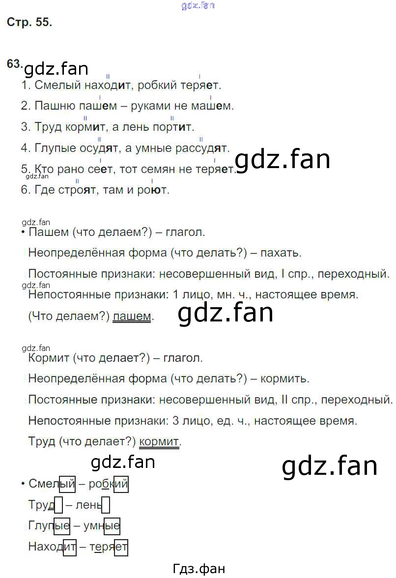 Проверка домашнего задания всегда занимает большое количество времени. На помощь приходит ГДЗ фан по Русскому языку четвертого класса. Здесь собраны популярные ответы на 55 (№ 63) Русский язык 4 класс рабочая тетрадь Песняева Н.А.