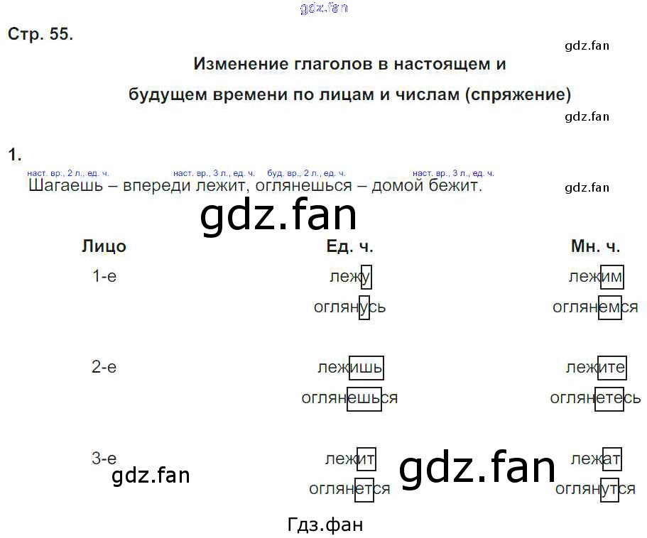 Проверка домашнего задания всегда занимает большое количество времени. На помощь приходит ГДЗ фан по Русскому языку четвертого класса. Здесь собраны популярные ответы на 55 (Изменение глаголов в настоящем и будущем времени по лицам и числам (спряжение) № 1) Русский язык 4 класс рабочая тетрадь Тихомирова Е.М. (к уч. Климановой)