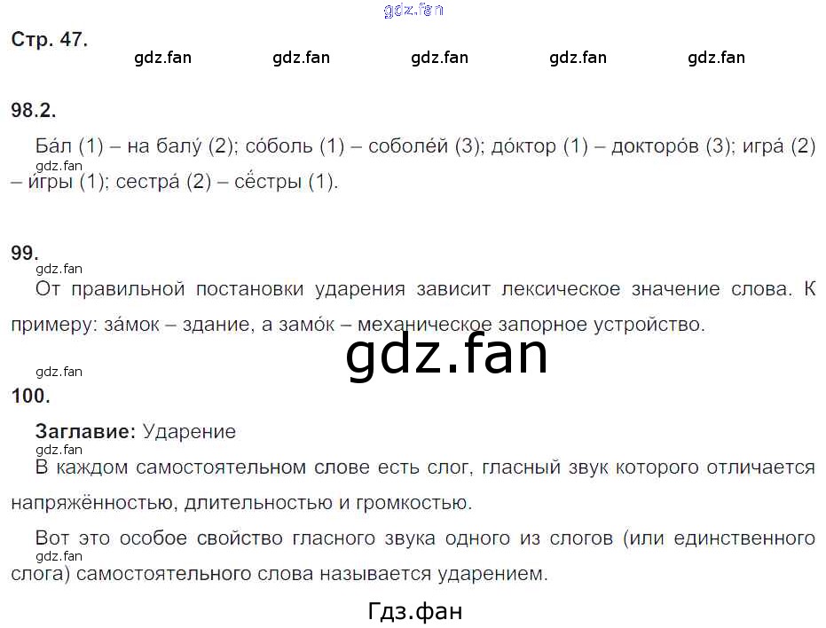 Проверка домашнего задания всегда занимает большое количество времени. На помощь приходит ГДЗ фан по Русскому языку пятого класса. Здесь собраны популярные ответы на 47 (упражнение 98, 99, 100) Русский язык 5 класс рабочая тетрадь Львов В.В. ( к уч. Разумовской)