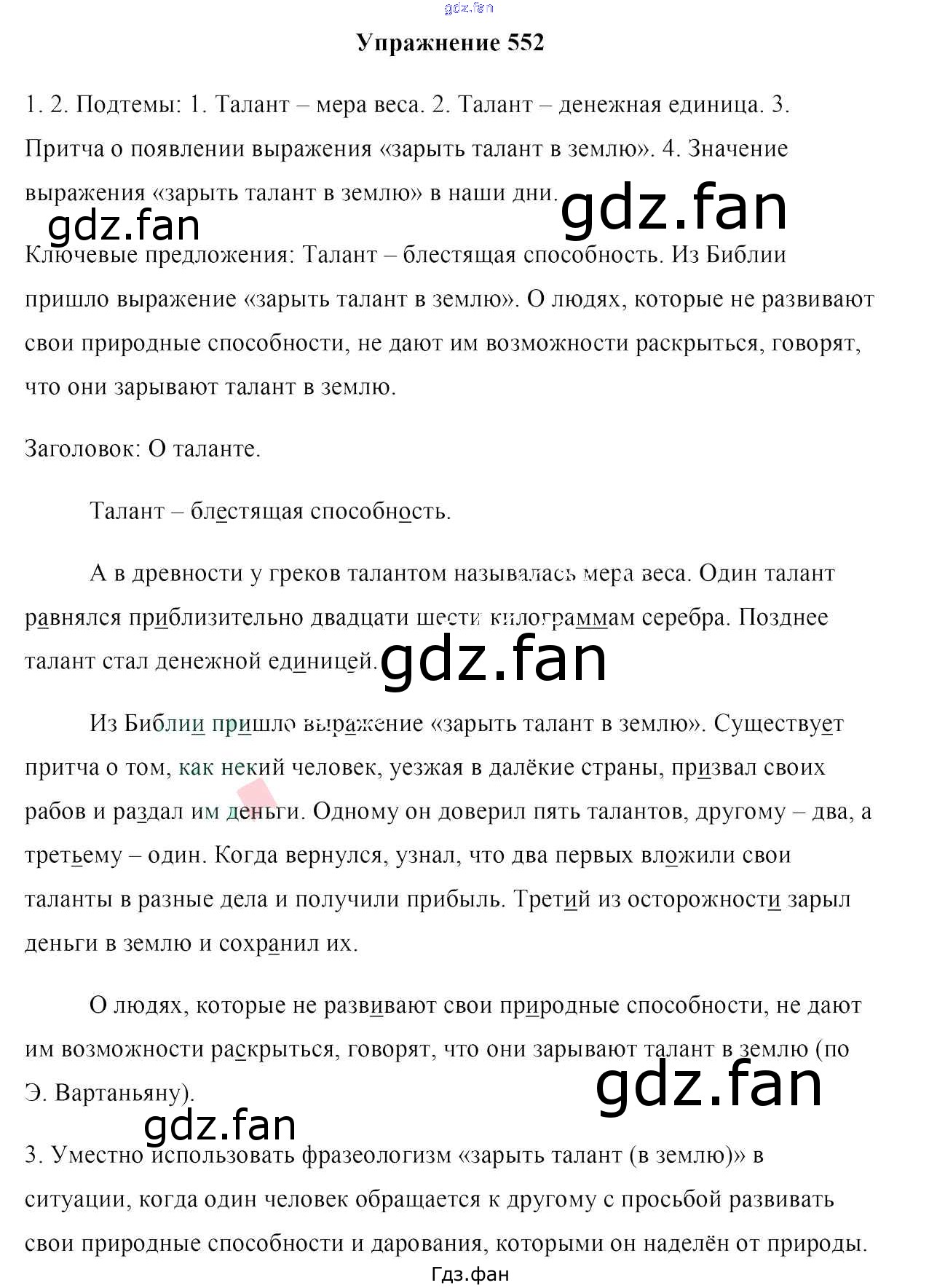 Проверка домашнего задания всегда занимает большое количество времени. На помощь приходит ГДЗ фан по Русскому языку шестого класса. Здесь собраны популярные ответы на 552 (стр. 231) Русский язык 6 класс Мурина Л.A.