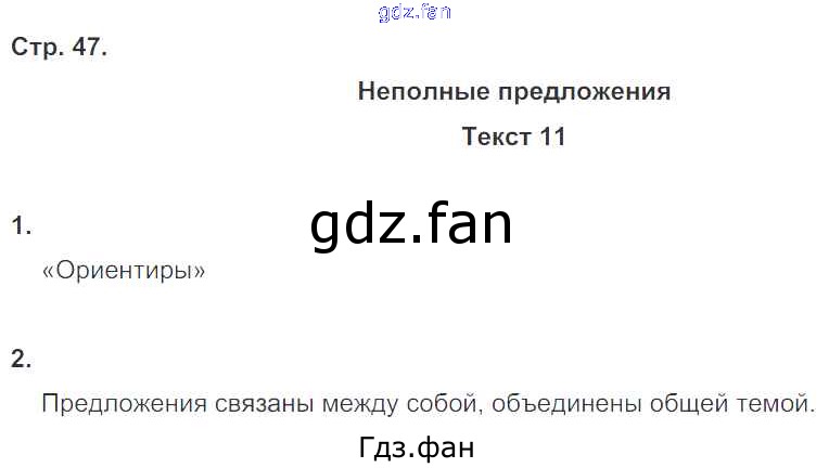Проверка домашнего задания всегда занимает большое количество времени. На помощь приходит ГДЗ фан по Русскому языку восьмого класса. Здесь собраны популярные ответы на 47 (Неполные предложения. Текст 11 № 1, 2) Русский язык 8 класс Комплексный анализ текста (Рабочая тетрадь) Малюшкин А.Б.
