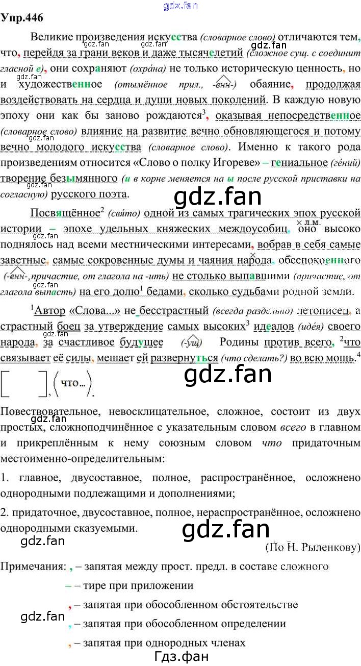 Проверка домашнего задания всегда занимает большое количество времени. На помощь приходит ГДЗ фан по Русскому языку девятого класса. Здесь собраны популярные ответы на 446 (стр. 213) Русский язык 9 класс Бархударов С.Г.