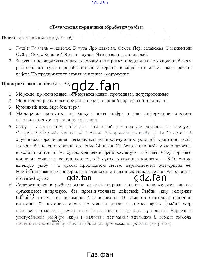 Проверка домашнего задания всегда занимает большое количество времени. На помощь приходит ГДЗ фан по Технологии шестого класса. Здесь собраны популярные ответы на 39 (технология первичной обработки рыбы) Технология 6 класс Синица Н.В.